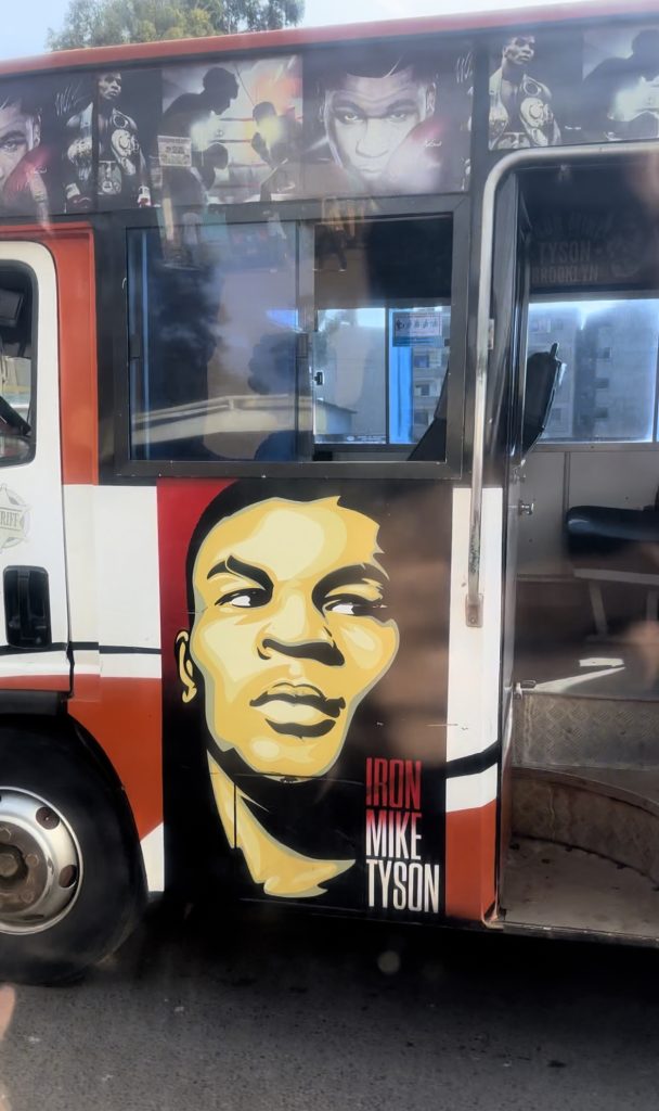 派手なバスが多いのもケニアの特徴。これはマイクタイソンの塗装が施されているバス。