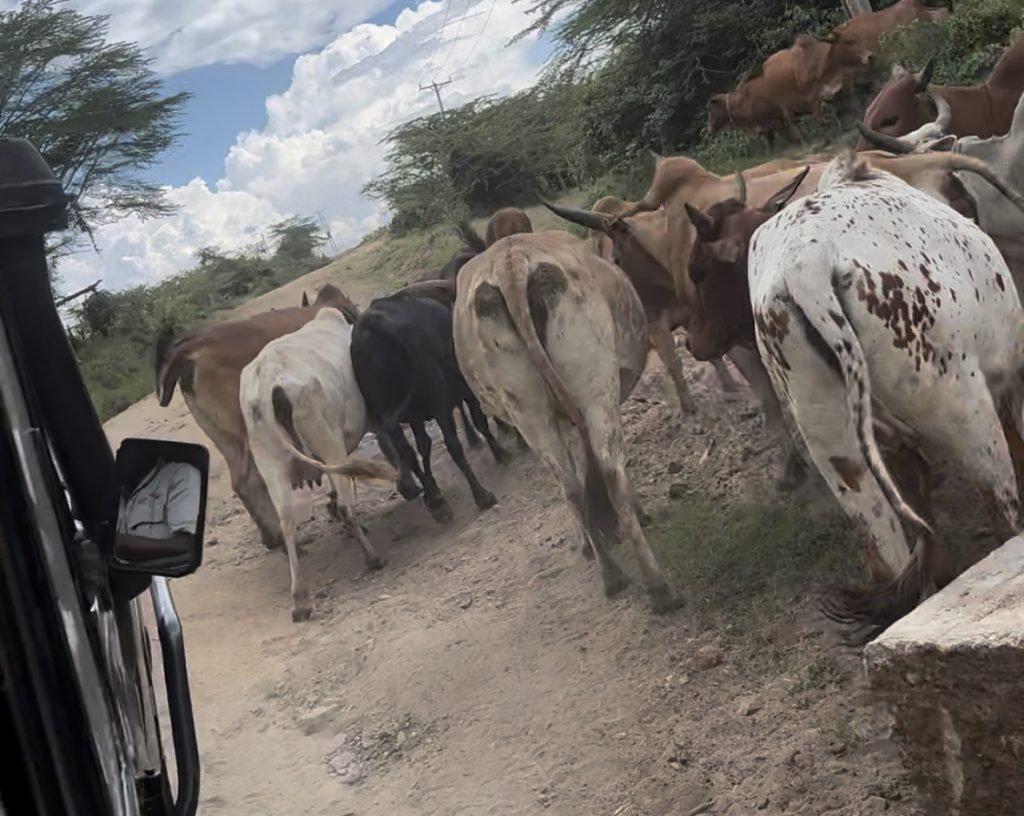 途中から舗装道路ではなくなり、オフロードに。アフリカあるあるの所々に牛の大群がいるので気をつけながら進みます。雨季の終わりに行ったので、道路もぬかるみかなりの悪路です。
