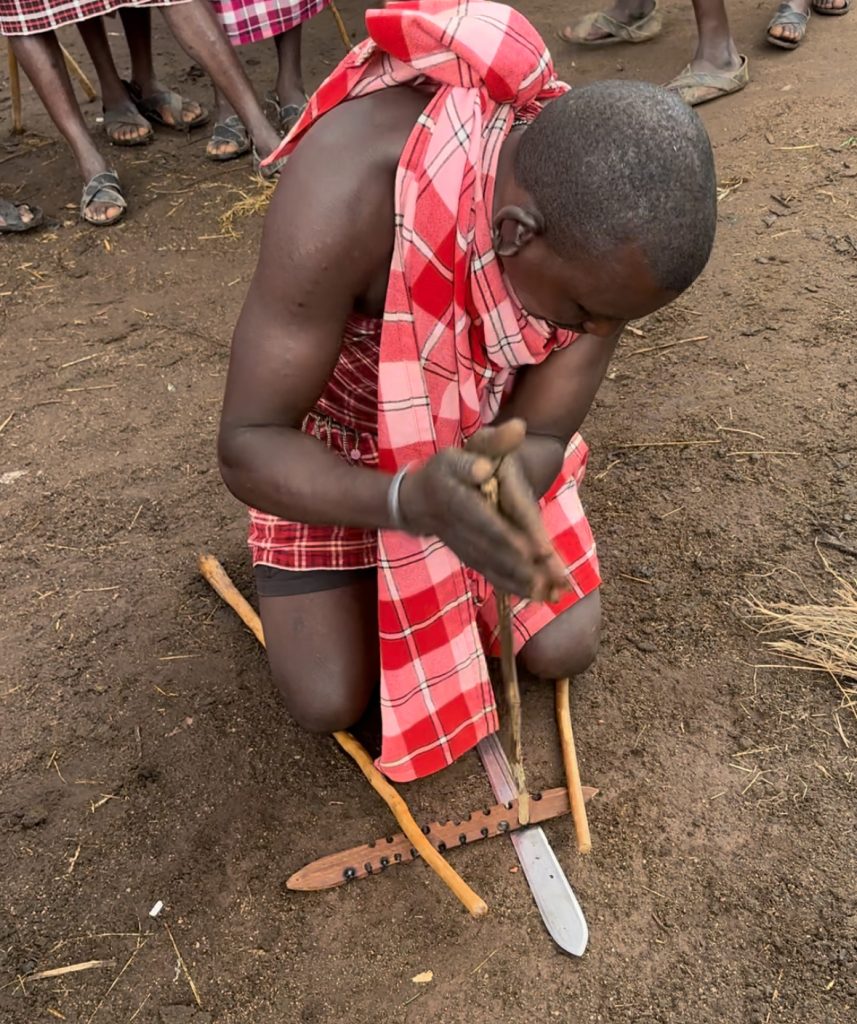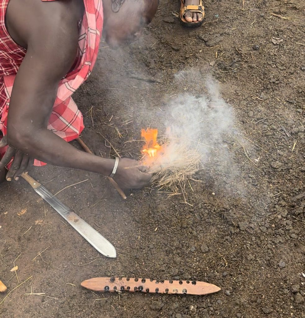 みるみる大きな火となりました。この後自分も火起こしに挑戦しましたが、煙すら立たなかったず。相当な摩擦熱が必要みたい。マサイ族の生活力の高さに感動します。