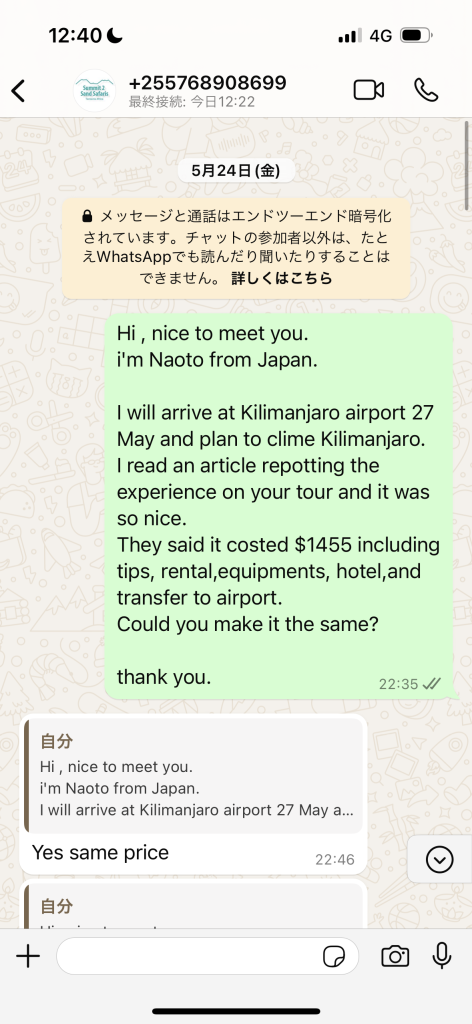 当初キリマンジャロ麓の街、モシにて旅行代理店を回って決めようかと思っていたのですが、治安面や1日無駄になることも考えると、事前に業者に連絡を取って決めた方が確実と思い、ウガンダにいるうちにWhat’s upで連絡をとりました。