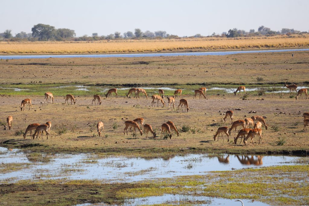 湿地帯に佇む、インパラの大群です。この川の向こう岸はナミビアだそうです。