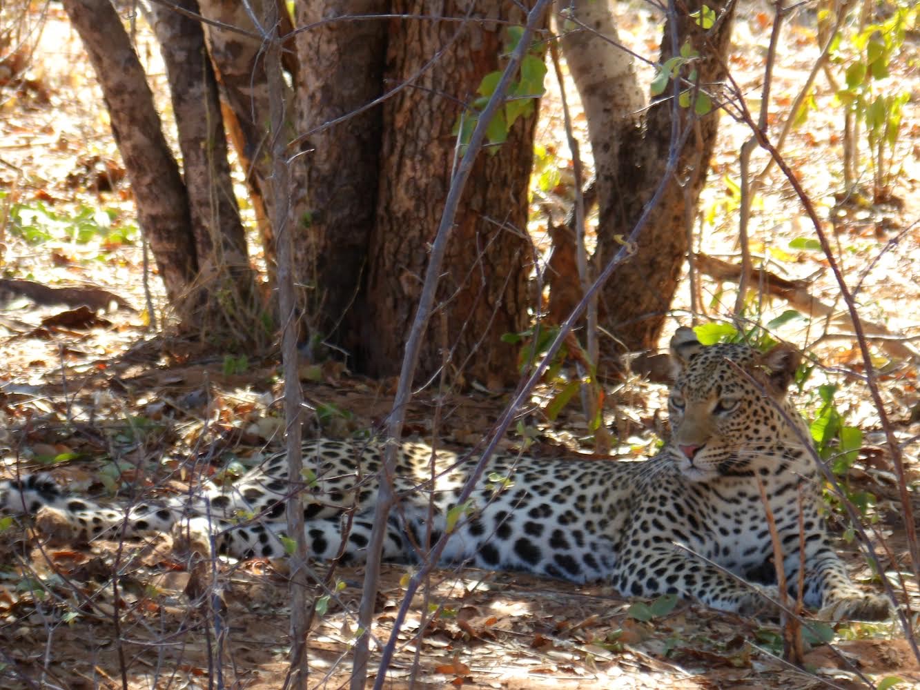 念願のヒョウです!サファリ7回目にしてようやく出会えた・・・聞くところによると1回のサファリでヒョウに出会える可能性は20%前後だそうでまさに、前評判通りの難しさ。こんな木影に、溶け込む豹柄を素人が見つけられるはずがありません。これはガイドがアッパレで拍手喝采となっていました。