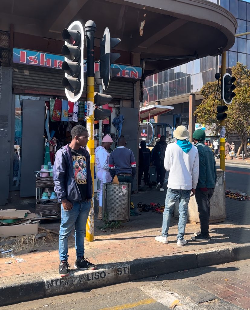 中心部の様子です。噂に聞いていた、赤信号を無視して縦横無尽に突っ切るというのはありませんでしたが、ところどころ信号機がついていなかったり、壊されたりしています。ガイド曰くここら辺はホームレスの数はヨハネスブルグで一番多いそうです。