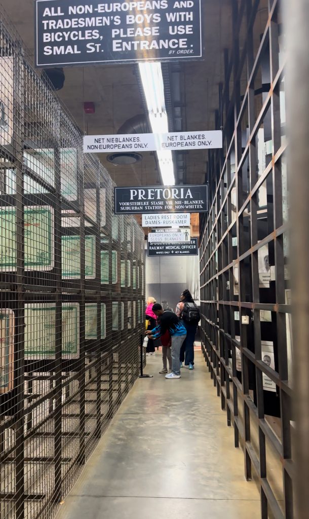 館内には当時実際に使用されていた白人用トイレ、ヨーロッパ人専用の出入り口、白人専用バス乗り場などと記載された看板やステッカーが吊るされており、アパルトヘイトの生生しさに息がつまります。