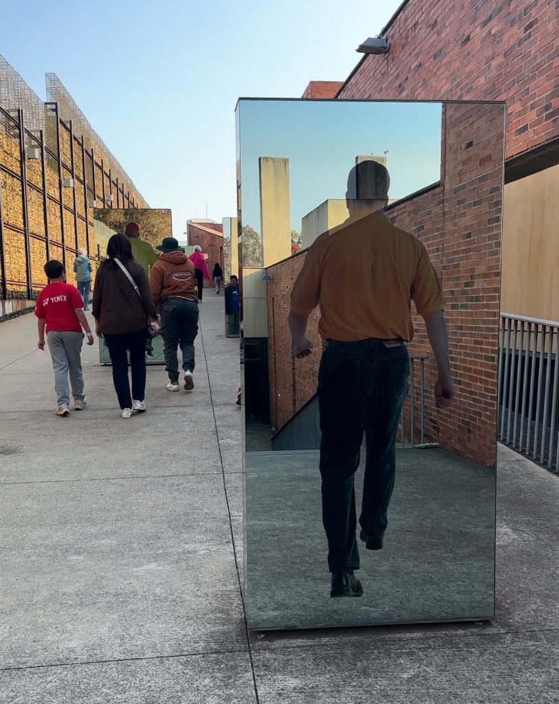 先ほどの建物を抜けると、『Journeys』という展示があります。様々な人の後ろ姿が鏡に転写されていて、鏡の正面に回らないと人種やその表情はわからないといった内容となっています。