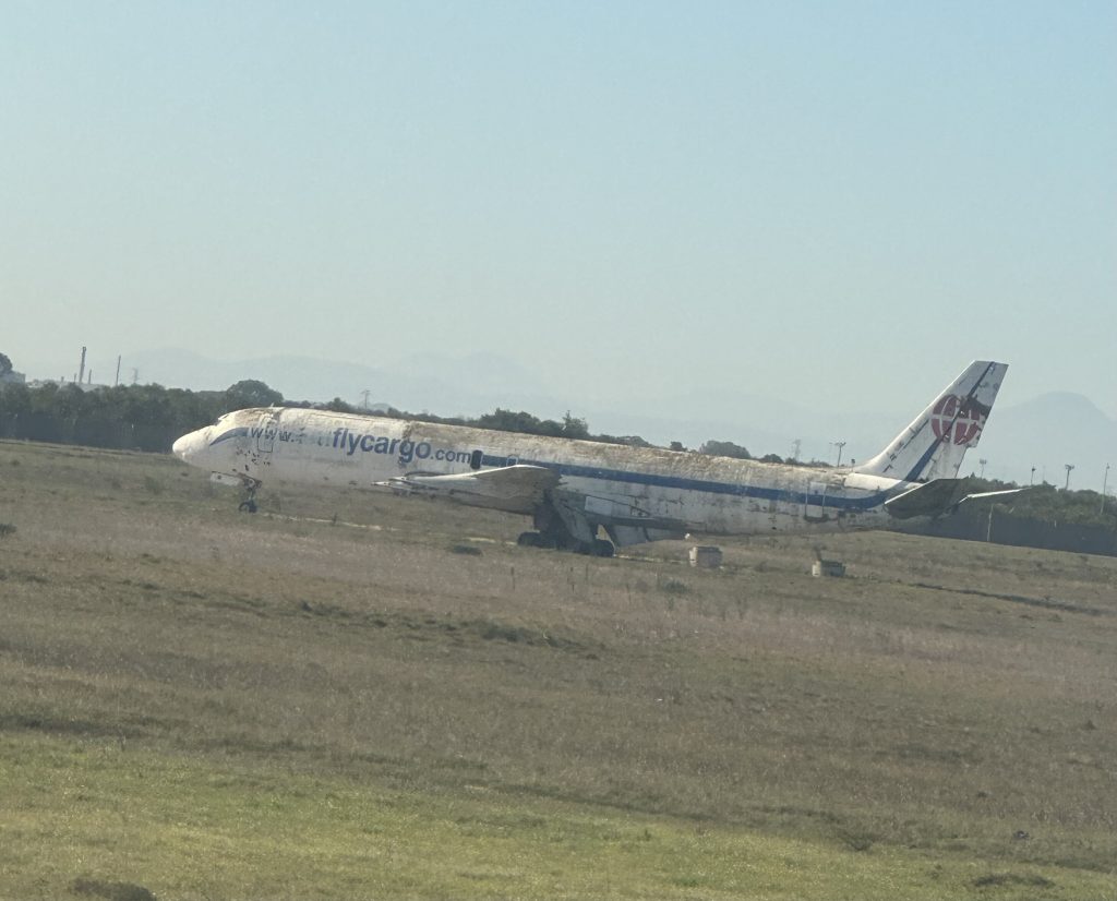 ヨハネスブルグのORタンボ国際空港ではミイラ化した飛行機の残骸が、滑走路横に放置されていました。これは一体何のためにここに置いてあるのか・・・すでにヤバそうな雰囲気出ています😅