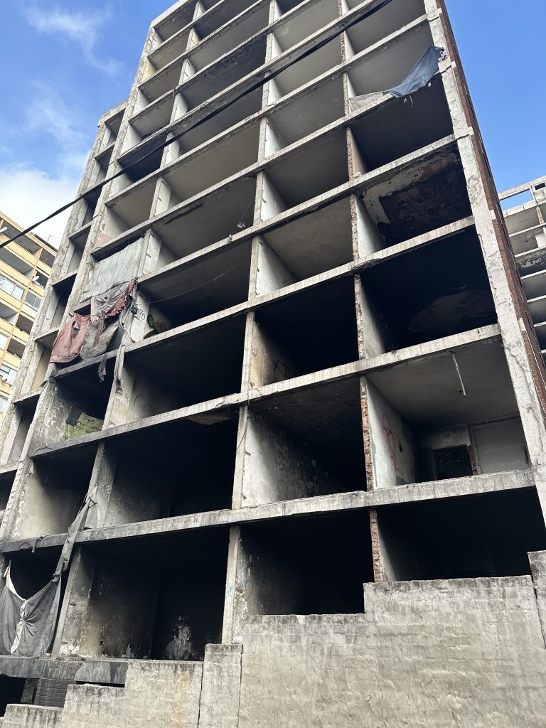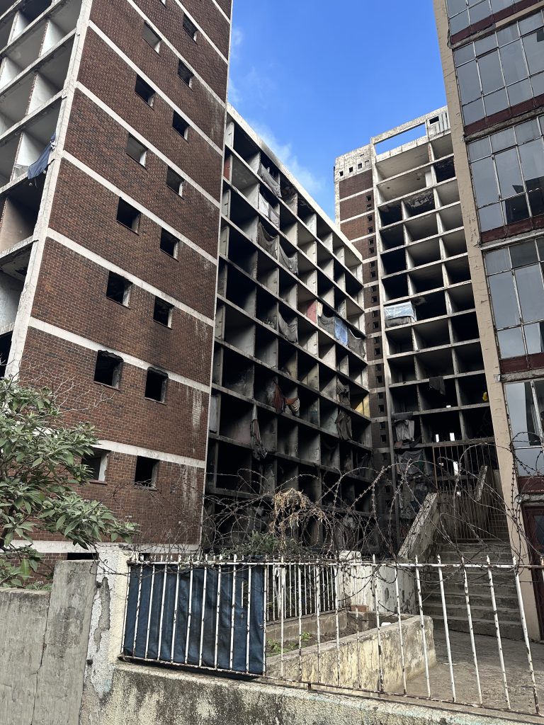 住民の多くが薬物中毒で、コロナ渦で失業し資金繰りに苦しむ中、マンション内の金属を取り壊し換金することで、購入資金を得ていたそうです。そのせいで、ほとんどのマンションの窓に鉄枠がなかったり、エレベーターまでない建物も存在します。ところどころ燃えたあとがあるのは、窓がなく寒さを耐え凌ぐために建物内で焚き火をするからだそうです。
